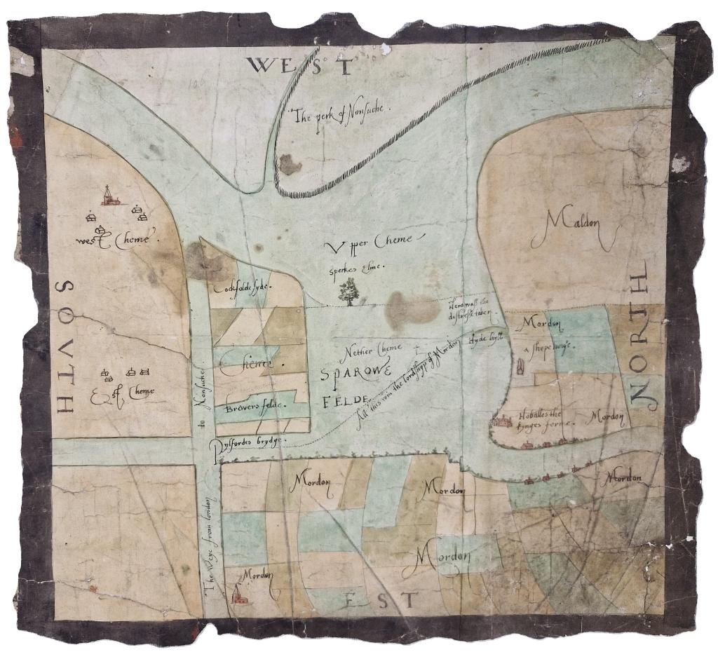 The expanse of common land that gives the patch its name was originally larger, providing for many commoners. By the 13th century, we know from early court documents that all was not well. As villages grew, it resulted in multiple disputes between parishes over grazing rights and firewood. The Sparrowfeld disputes would go on for nearly three centuries, during which time Henry VIII would appropriate 900 acres for his Great Park of Nonsuch, now Worcester Park. Part of the remaining land would become Cheam Common and Morden Common. The map below was drawn up to help settle a dispute between Morden and Cheam in 1553 (courtesy of the National Archives).